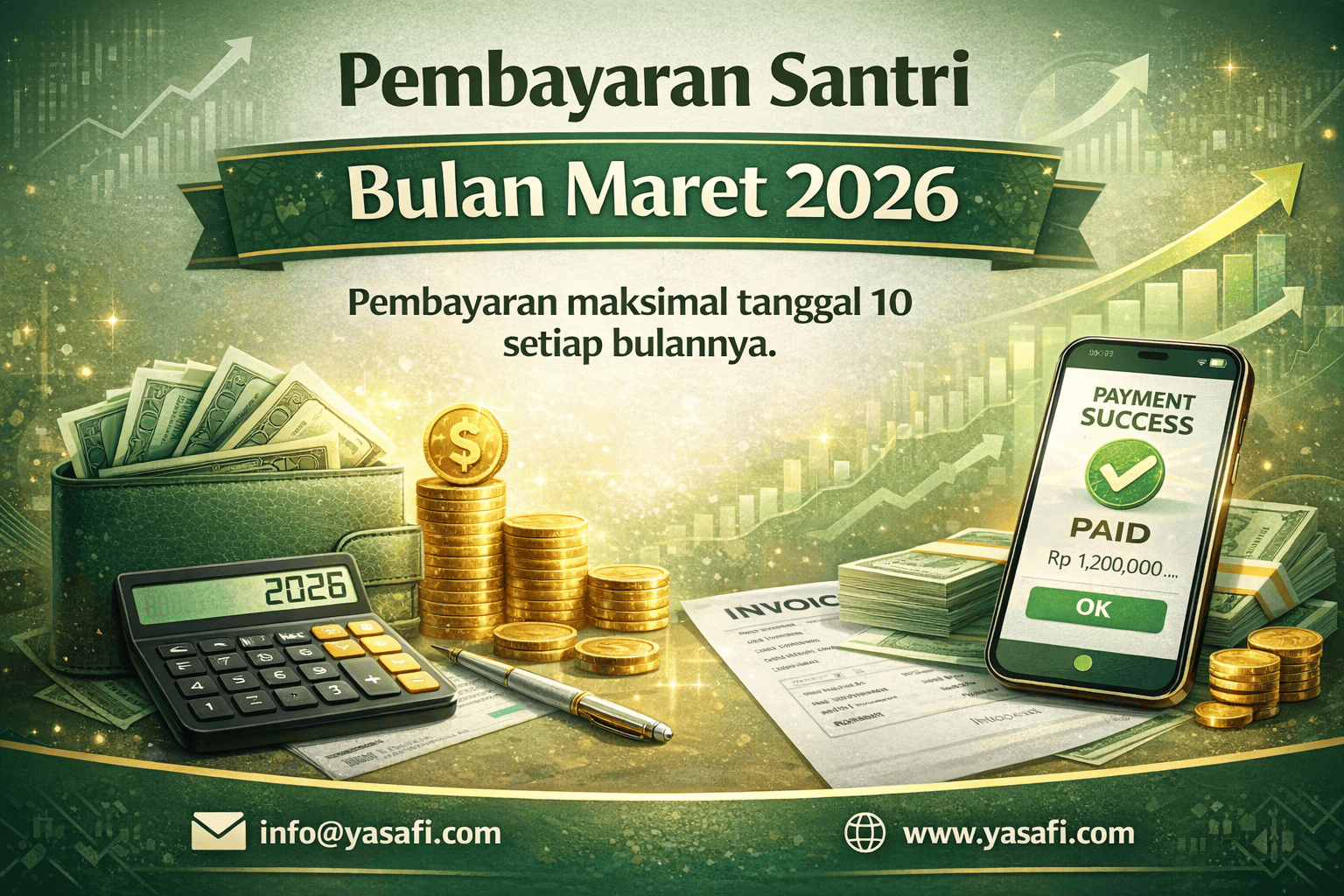 <p>Pembayaran santri bulan Maret 2026, sebegai berikut:</p><ol><li>Pembayaran bulanan (makan santri) : 120.000</li><li>Pembayaran laundry : 60.000</li></ol><p>Perlu kami sampaikan bahwa pembayaran maksimal tanggal 10 setiap bulannya.</p><p>Mengetahui,</p><p><strong>Sie Keuangan PP. As-Syafi'iyyah</strong></p><p><strong>__</strong></p>